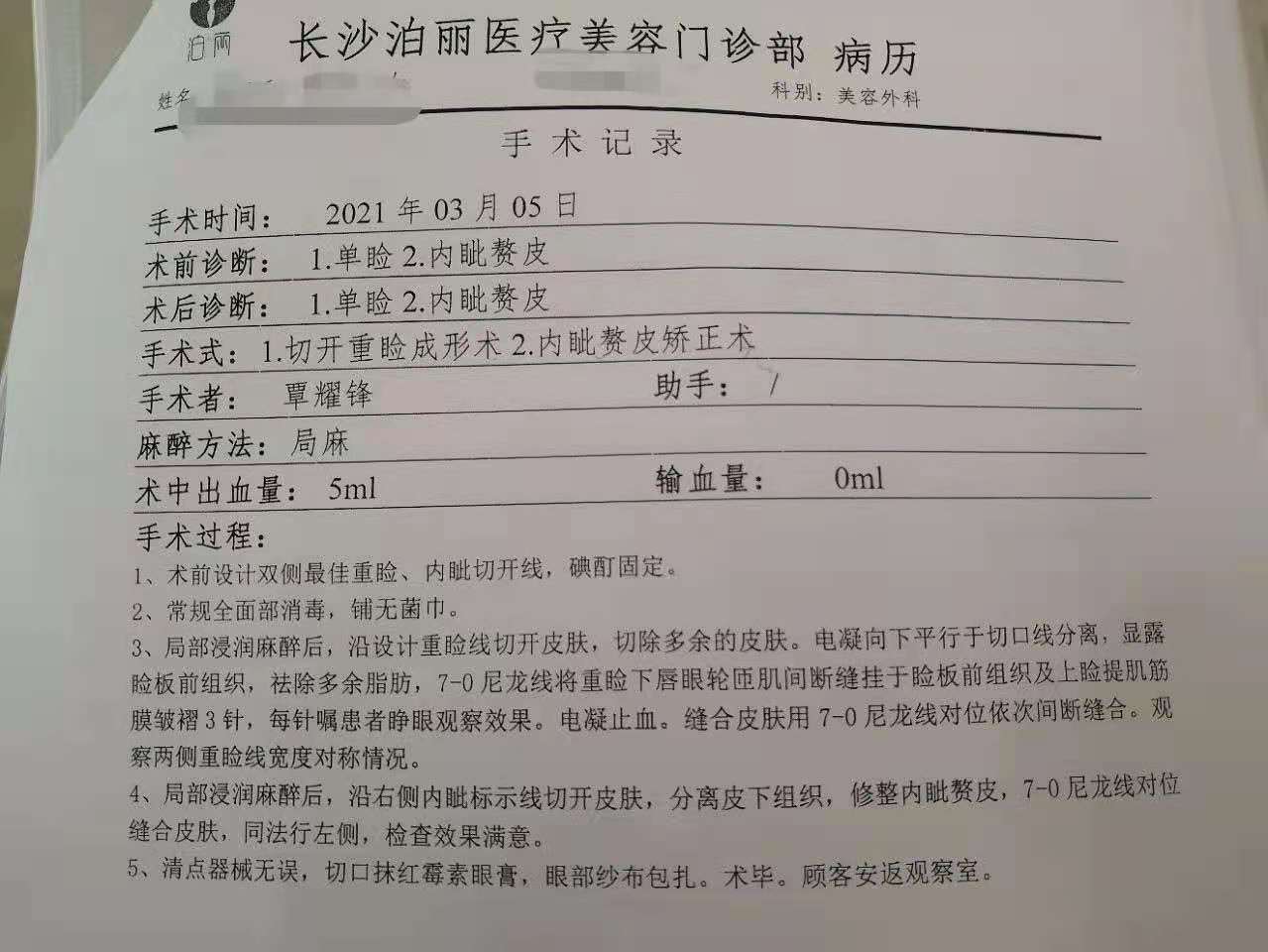 泊丽客服部经理李皓恺解释说:“双眼皮手术只是张女士手术中的一项,做双眼皮还需要做一些辅助项目,张女士眼部手术包含了重睑成形(割双眼皮)、内眼角增大、去皮去脂、轻度肌无力调整等四个项目,最终费用为18638元。术前我们已告知张女士要做的项目及价格,经她本人签字确认无异议后才进行手术。不存在欺骗消费者。”