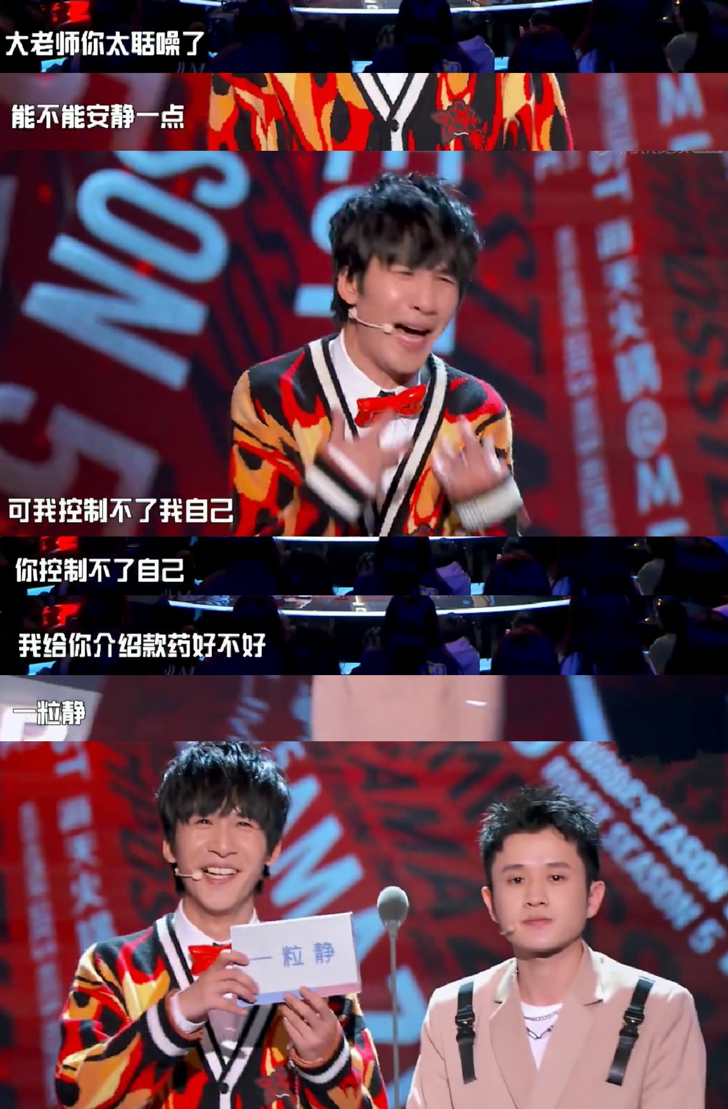 王勉还在送给大张伟一盒药,包装盒上竟然写着“一粒静”,一边谐音了人狠话不多的易立竞,换着法儿地吐槽大张伟话多。