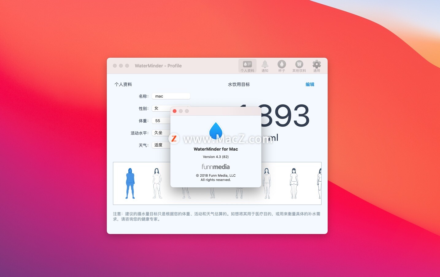 1.WaterMinder for mac补水健康健美软件(坚持喝水,养出好皮肤)
