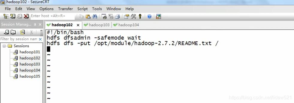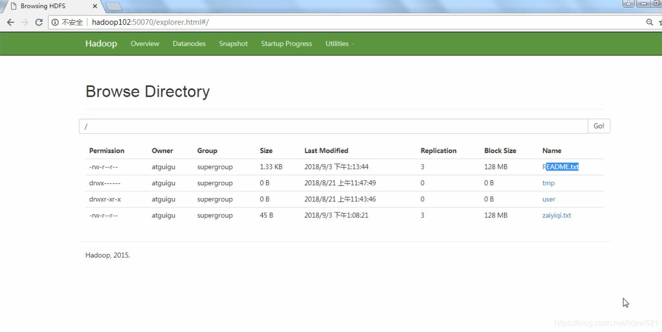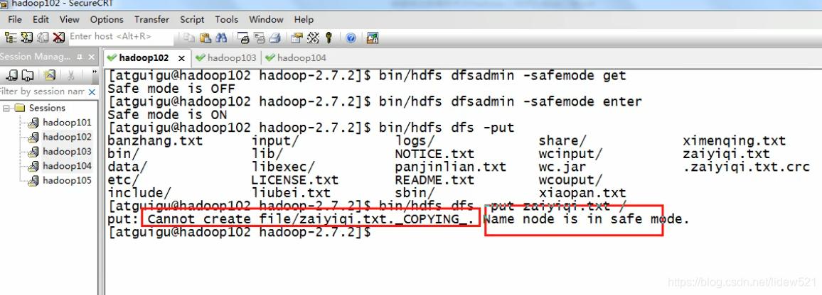 hdfs dfs -put /opt/module/hadoop-2.7.2/README.txt / 这一句是上传README.txt文件到hdfs的根目录,但是他会阻塞到,安全模式退出,才会上传成功.