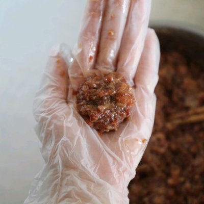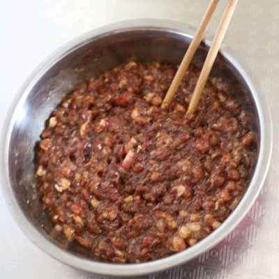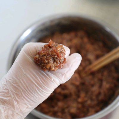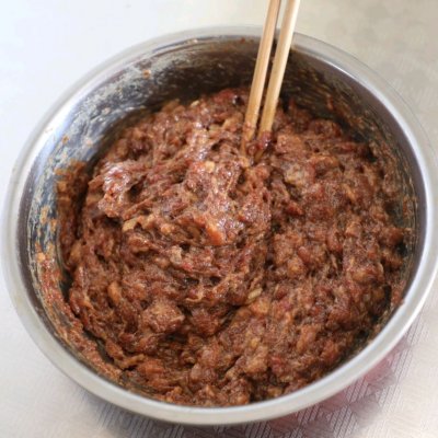 3、分次少量加水,每次加水后都顺着一个方向搅打,感觉肉馅充分吸收水分,直至肉馅上劲儿。