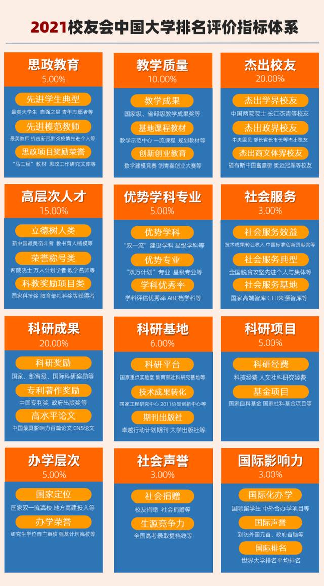 报告显示,北京大学、清华大学、上海交通大学位居校友会2021中国大学排名前3甲,浙江大学、华中科技大学跻身全国前5名。哈尔滨工业大学、西北工业大学、合肥工业大学雄居校友会2021中国工业大学排名前3甲;青岛工学院、郑州工业应用技术学院、武昌工学院问鼎2021中国民办工业大学排名前3强。