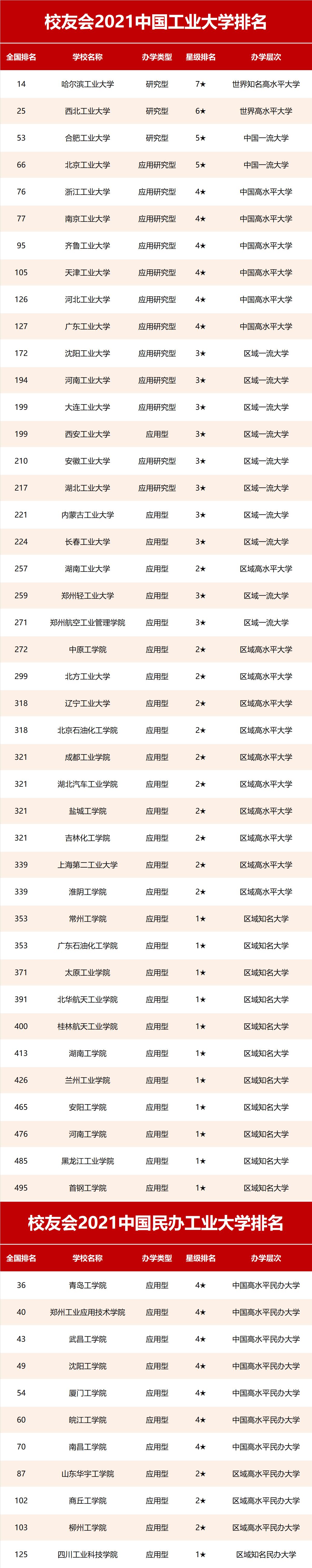 在最新校友会2021中国民办大学排名(I类、Ⅱ类、Ⅲ类)中,青岛工学院全国排名第36名,雄居校友会2021中国民办工业大学排名冠军,是2021年中国民办工业高校中办学实力最强、办学水平最高的大学。郑州工业应用技术学院全国排名第40名,居第2;武昌工学院全国排名第43名,列第3。