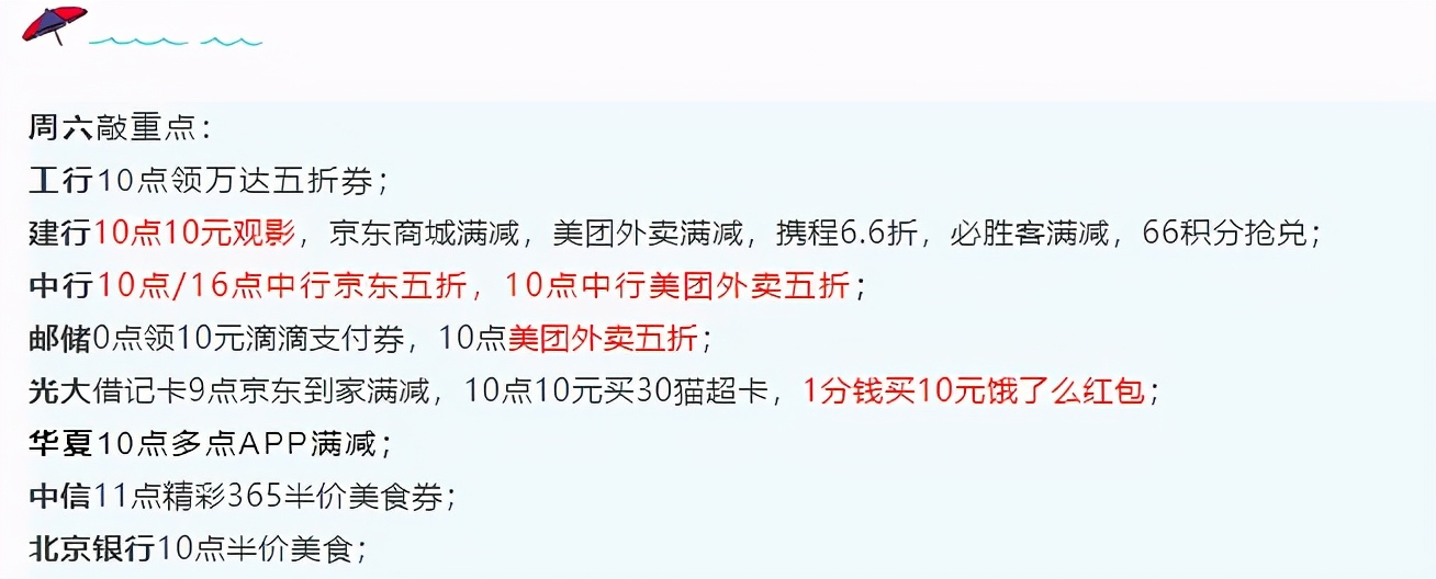 中行10点/16点中行京东五折,10点中行美团外卖五折;