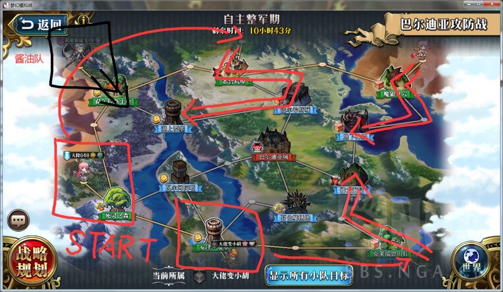 大体的进攻规划3个队伍右下、右上、正上3条路推进,酱油队到左上的萨尔拉斯平原磨血把湖上要塞的路打通。