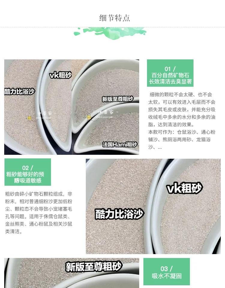 先来介绍一下浴沙的主要作用:经高温杀菌;有效去除仓鼠身上异味,保持环境干爽及清香;通过沐浴过程而加强运动量,确保仓鼠健康;极少粉末,可避免影响仓鼠的呼吸系统及眼睛受损;保持仓鼠身体干爽,可预防脱毛及各种皮肤病症。