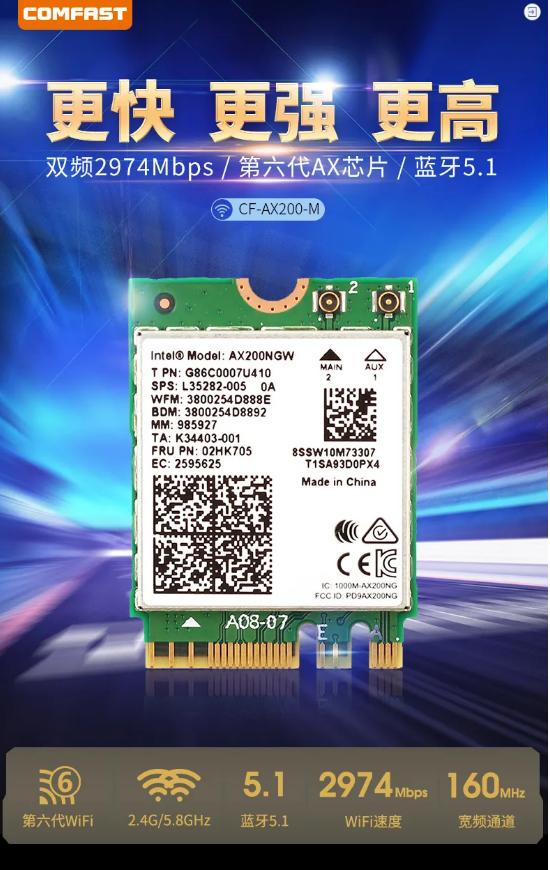 作为无线网卡行业的风向标品牌COMFAST,最新推出的笔记本无线网卡,有支持最新WiFi6标准,无线速率高达2974Mbps的代表作CF-AX200-M,也有老少皆宜的2033Mbps和1200Mbps无线网卡。