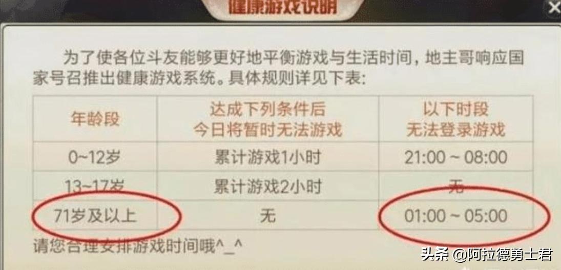 原来作为一款及时竞技游戏,斗地主不光光对于玩家的年龄下限有要求,而且对于年龄高的玩家同样限制了游戏时间,71岁的玩家在凌晨1点到5点的时候是无法登录游戏的。而这个时间段正是这名玩家玩斗地主的高峰时段,难怪这名玩家后悔了,这真的是悲剧了啊。
