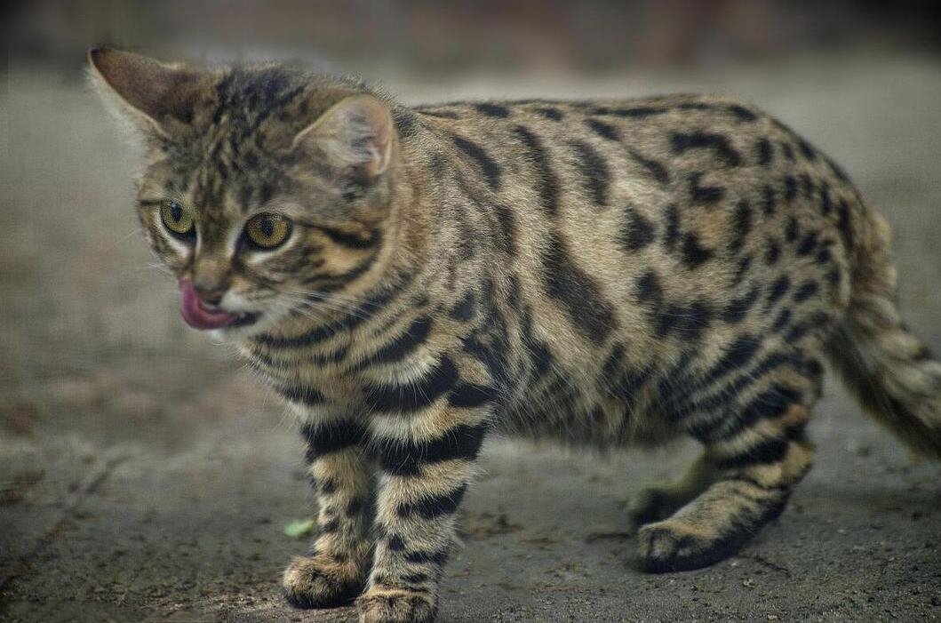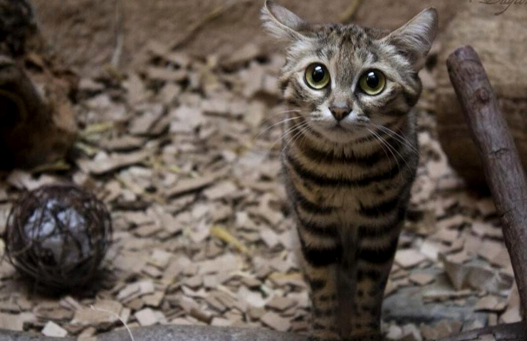 黑足猫是世界上最小的猫科之一,平均体重仅有1.6公斤,体长在30到50厘米左右,遍体都是类似虎斑的黑色纹路,尾巴尖也是黑色的。