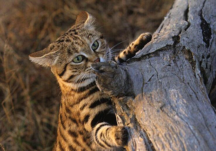 黑足猫只生活在非洲南部,喜欢灌木和半荒漠的环境,不需要水,光靠捕猎鸟类和昆虫就能生活。