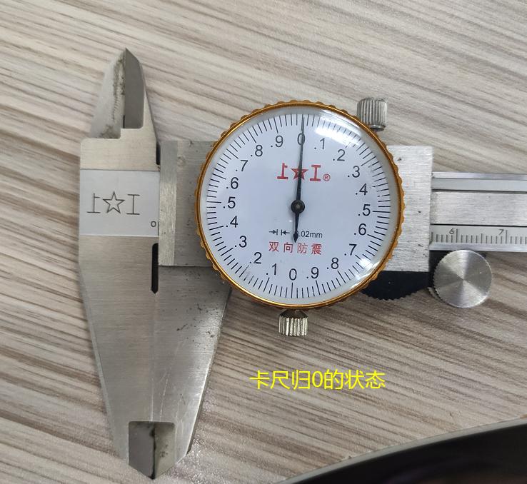 调教螺丝,当你的卡尺用一段时间后, 可能读数不准。怎么判断准不准,首先将卡尺归0,也就是将滑动部分推到最左边,保证两头的内爪和外爪都分别挨到一起了,这时候看你的表盘,指针是否正好指在表盘上的0刻度位置。如果指针没有正对0刻度位置,这时候就将调教螺丝松开,用手转动表盘上半部分,直到指针正对到表盘的0刻度位置。然后将调教螺丝再次拧紧。这样卡尺就校准了。