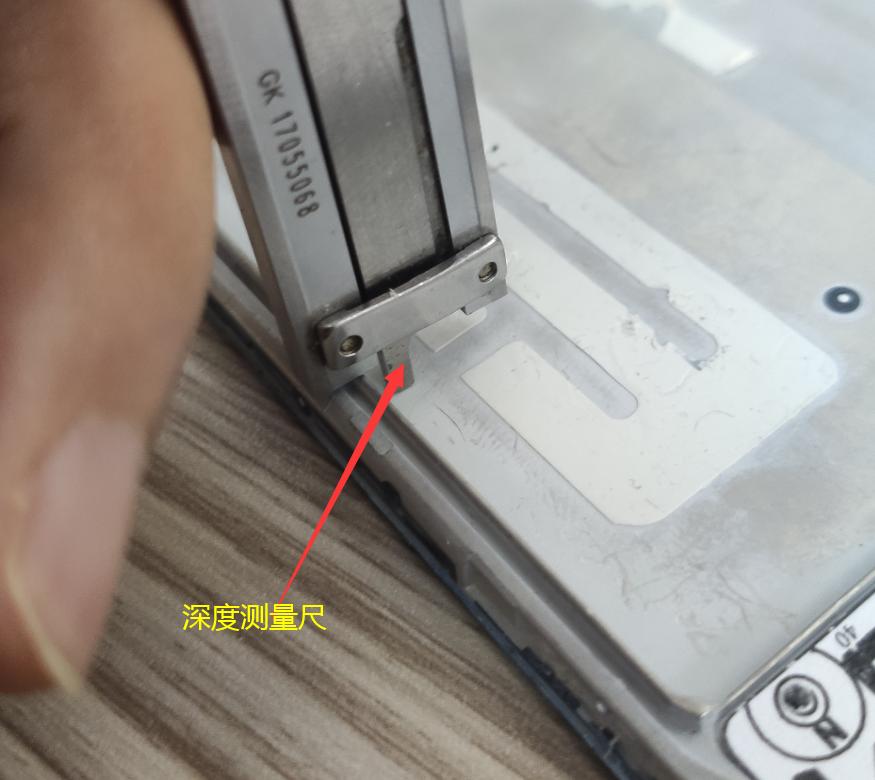 最后,我们再看下深度测量尺。当我们把卡尺向右滑动一段距离后,右边尾巴上露出来那一部分就是可以用来测量深度的,我们把它叫深度测量尺。如下图所示。测量深度的时候,读数的方法和上面讲的一样,也是将刻度尺上的整数部分加上表盘上的小数部分。这里要提醒的是:测量深度的时候,我们一定要将被测物体放在平整的桌面上,卡尺也要尽量垂直,这样测量的结果才比较准确。当然能用夹持的方式测量就尽量不要用深度的方式测量。