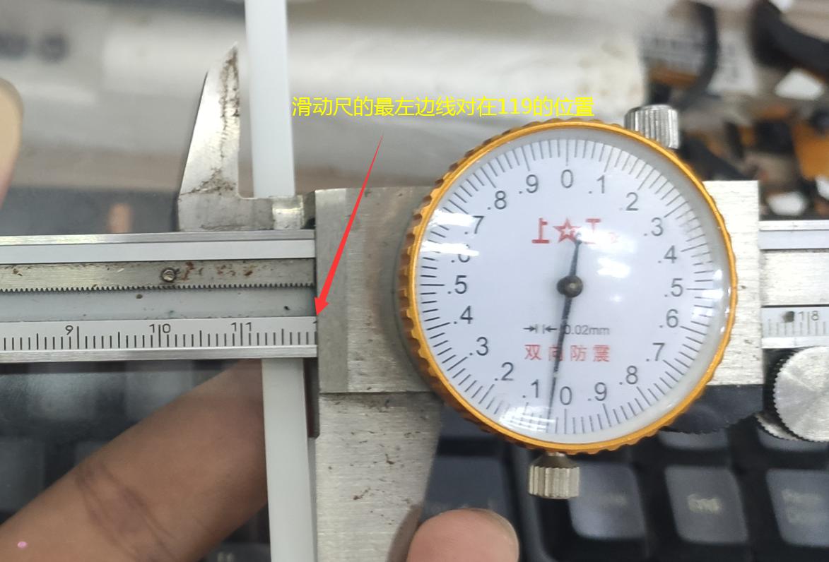 刻度尺,就是我们测量的时候读数的整数部分。当我们将尺子滑动一定距离后,观察滑动尺的左边线对准在刻度尺上的什么位置,这时候读数的整数部分就是多少。再将表盘上的小数部分相加,就是测量结果。用下面图片举例,我们看到滑动尺最左边对在了刻度尺上的119的位置,这时候数据非常接近119,我们再看表盘上的指针,对在了2个最小刻度的位置,也就是2个0.02mm,即0.04mm。那么我们将2者相加,就是119.04mm。如果这时候表盘上的指针没有到0的位置,在0的右边2个刻度,那么我们读数就是119-0.04=118.96mm了 。