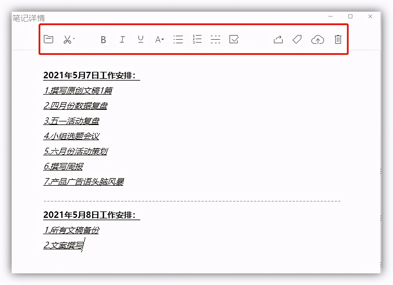 如果你经常用PC端微信,使用收藏笔记功能进行办公更方便。可以对笔记进行:字体加粗/倾斜、添加下划线、设置字号、项目符号、分割线等。