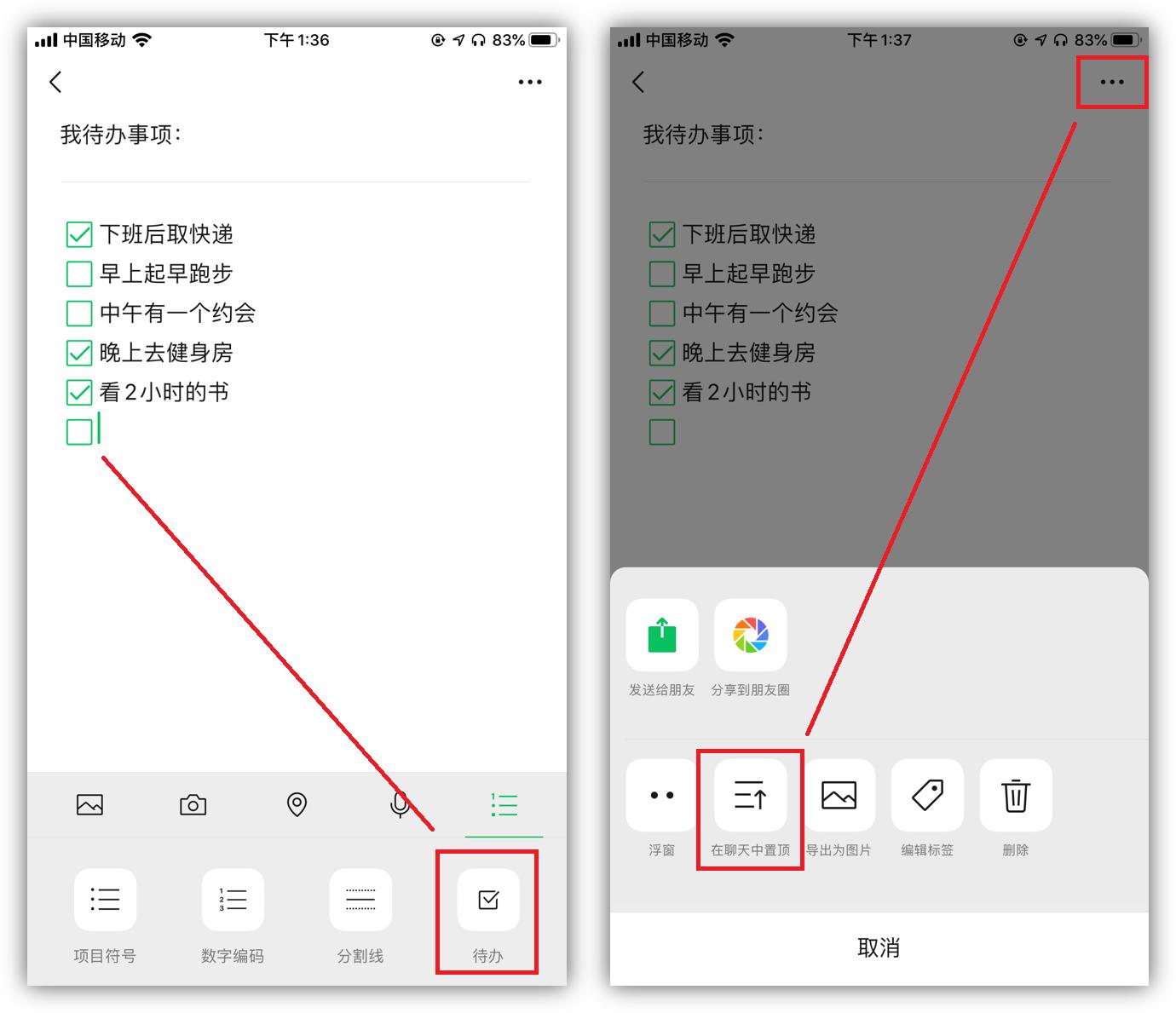 生活中有太多的琐事?不如用微信的待办功能,一件件地记录下来,完成一项勾选一项,再也不怕忘记做每一件事了,并且可以将它在聊天中置顶。