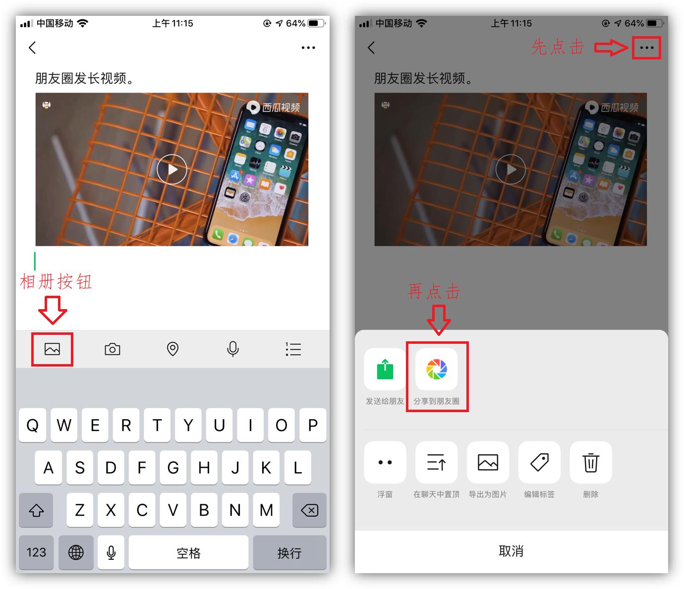朋友圈最大支持30秒视频,利用微信的收藏功能,可以发5分钟的长视频哦。先点击键盘左上方的相册按钮,添加视频后,再点击右上角的「···」,选择「分享到朋友圈」。