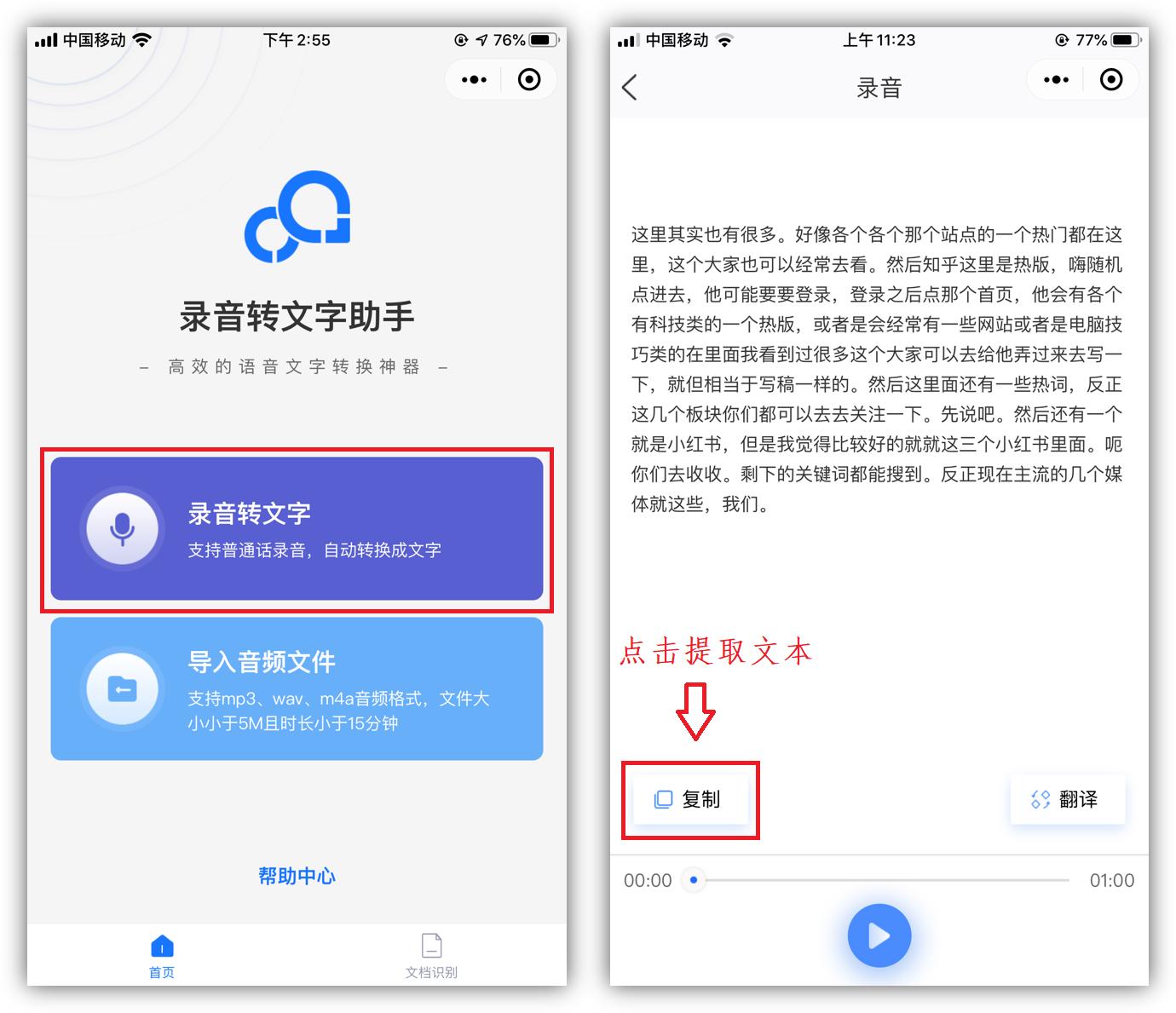 或者你也可以打开「录音转文字」小程序,这里可以实时将语音转成文字,然后将文本提取出来,整理成一份完整的会议纪要。