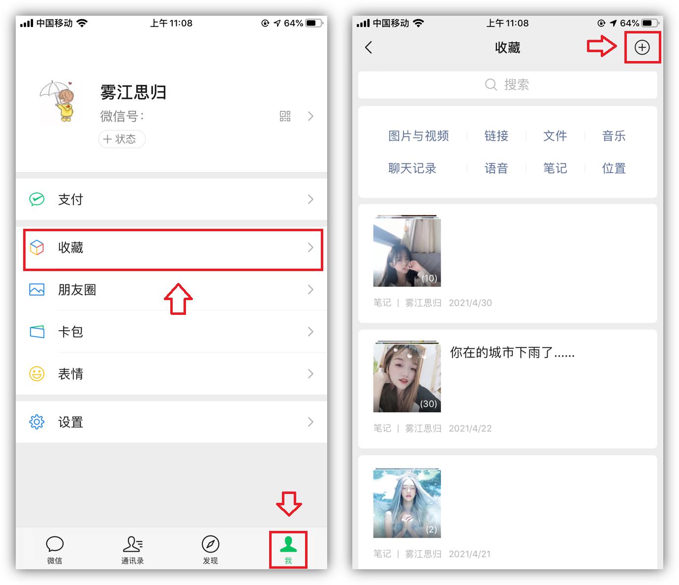 首先打开微信,点击右下角的「我」,就可以看到「收藏」功能,进入后,点击右上角的「+」,即可新建笔记。