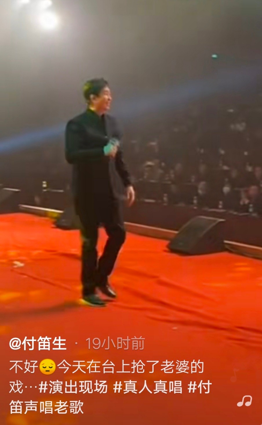 3月18日,歌手付笛生在某社交平台发布了一段自己登台演唱的视频,并配文:今天在台上抢了老婆的戏。