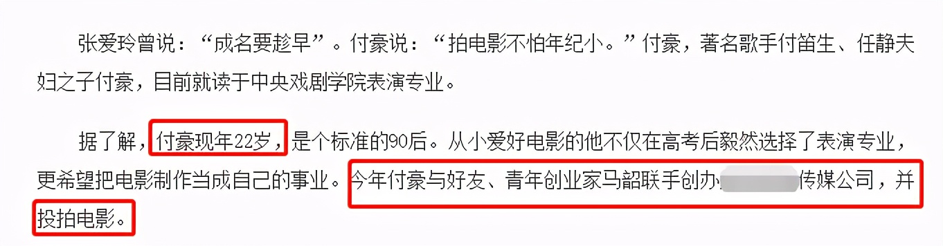 而在音乐之外,付豪因为喜欢电影,便在22岁时候就与朋友开了家电影投资公司,注入资金高达百万,如今已是身价不菲的总裁。