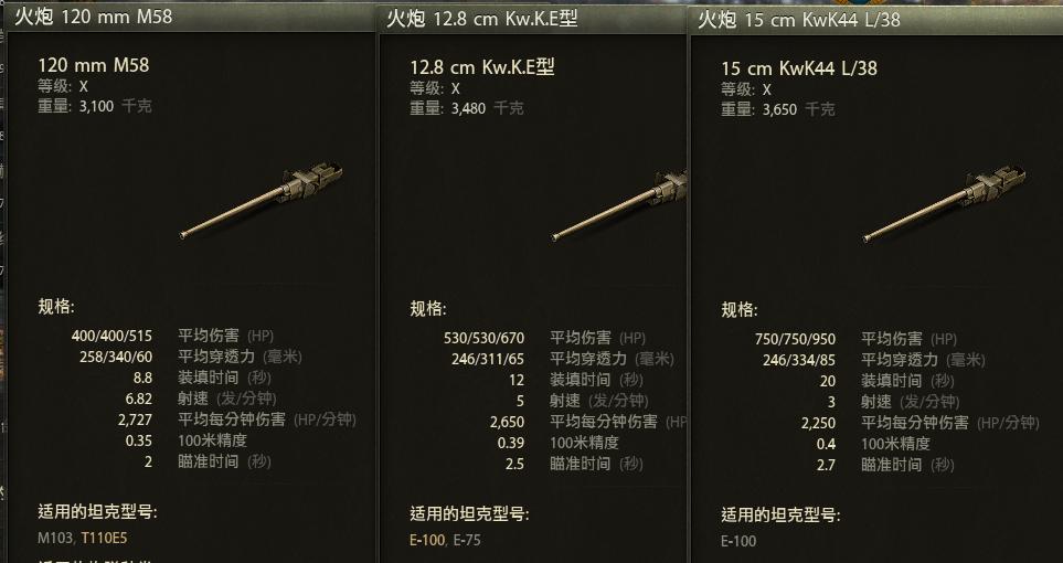 T110E5使用一门非常西方化的120毫米口径M58坦克炮,普通弹药为AP弹,平均穿深258毫米,特种弹药为HEAT弹(破甲弹),平均穿深340毫米,这两种弹药的平均伤害均为400点。而E-100却可以从128毫米口径火炮和150毫米口径火炮中选择一门,128炮的单发伤害为530点,两种穿甲弹的平均穿深为246和311毫米。150炮的单发伤害为750点,两种穿甲弹的平均穿深为246和334毫米。128炮的特殊弹药是次口径穿甲弹,而150炮的特殊弹药是破甲弹。