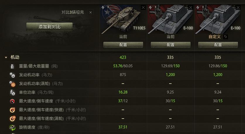 T110E5的整体重量只有53吨左右,但是发动机功率达到了875马力,因此功重比达到了16.28马力/吨,而前进极速也有37千米/时,车体旋转速度达到了37.51°/秒。而E-100却是“超重型坦克”,因此该车的自身重量达到了惊人的129吨,即使发动机功率高达1200马力,也只有9.24马力/吨的功重比,极速只有30千米/时,车体旋转速度也只有27.51度/秒,相对于T110E5来说要笨拙不少。