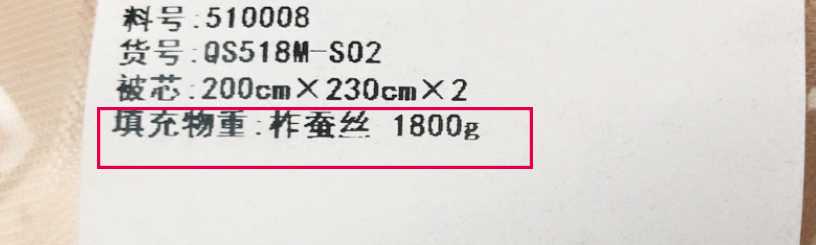 一定注意标牌上的填充物,有的商家的标签上只写“100%纯天然蚕丝”、“100%蚕丝”,不写明桑蚕丝还是柞蚕丝,肯定是有问题的。另外要注意你买的是冬被还是夏被,它的填充重量是不一样的,夏被空调被这种一般是在500克左右,冬被在1500-2000克左右。