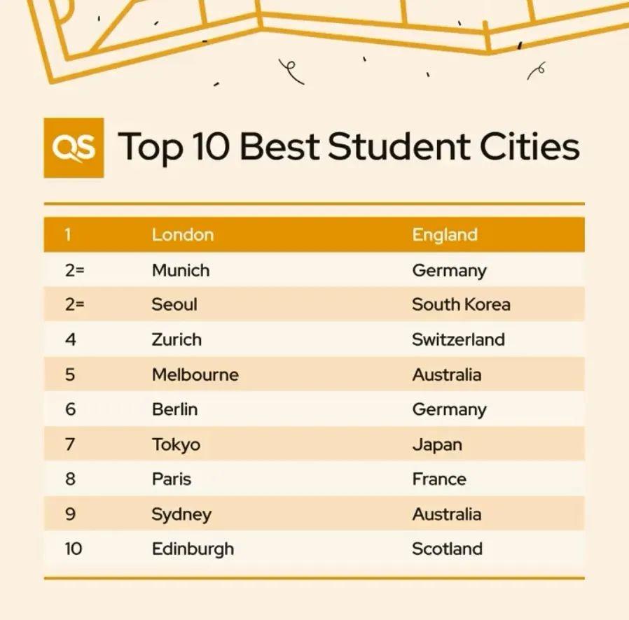 在今年QS发布的《2023年最佳留学城市排名》(Best Student Cities)中,爱丁堡也有着非常亮眼的表现,位居世界第十,在英国各大城市中仅次于伦敦。
