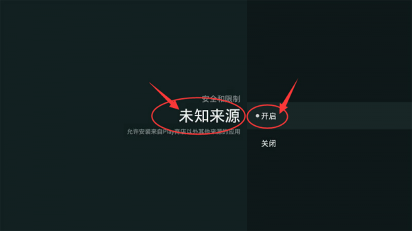 然后进入打开索尼电视【个人】-【安全和限制】,把【未知来源】开启,这样准备工作就已做好;