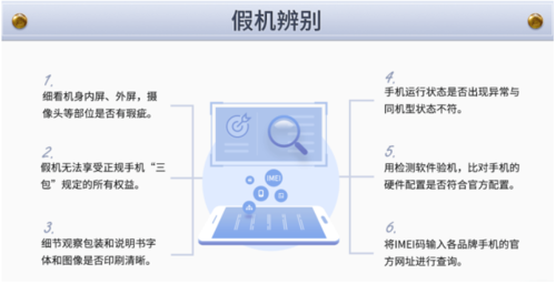 比如,在购机前,消费者可以通过鲁大师或者手机品牌官网,对想要购买的手机配置做一个大致了解;购机时,仔细观察手机包装和字体图像是否印刷清晰,仔细查看机身外屏、内屏及手机摄像头有无瑕疵;购机后,一旦产生问题,可以将IMEI码直接在手机官网查询处输入,或者最简单便捷的方式是登录鲁大师手机APP,免费为消费者提供手机硬件测试,看看是否与官方硬件配置相符。