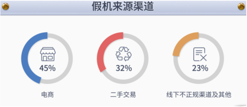 假机的主要来源渠道,45%来自于电商,32%来自二手交易,线下不正规渠道及其他渠道占23%。通过以上数据,我们不难看出,在线下正规品牌专卖店买到假机及记录和概率是微乎其微的,在此我们呼吁消费者认准品牌专卖店,在正规品牌店进行正规交易。
