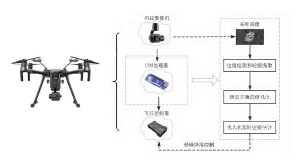 精准降落的完整流程是:当无人机巡检结束返回时,无人机会飞到降落地点上方,此时无人机的视野内将出现Marker标识,并触发自主精准降落程序。无人机将采集到的降落标识(Marker)图像传送给视觉计算平台,实时计算出无人机与Marker的相对位置关系,将相对位置坐标传入飞控系统,飞控将控制无人机完成自主精准降落动作。