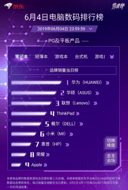 6月4日的京东电脑数码排行榜的实时数据显示,华为PC及平板产品超越联想、小米、华硕等品牌,获得了6月4日当天电脑数码排行榜中笔记本和轻薄本品牌的双料冠军华为新款MateBook X Pro和MateBook13/ 14等俨然已经成为覆盖高端轻薄本和主流轻薄本领域的佼佼者!