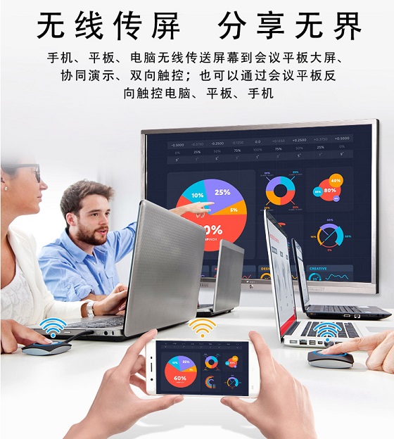 无线传屏可实现电脑、平板、手机屏幕内容无线传屏到会议平板,可在多台设备间进行随意切换,无论是视频、文件,还是图片都能够无延时、无卡顿传输;多个设备随时切换、随时介入;