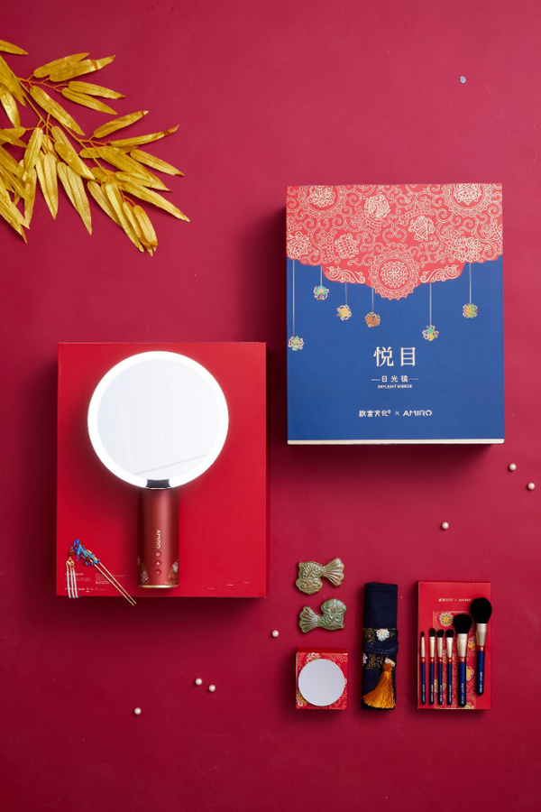 在外包装礼盒上,更是将红、蓝两色完美结合,以顶部寓意吉祥的烫金八宝纹,结合垂坠设计,形似新娘“红盖头”,让美镜更添美意。