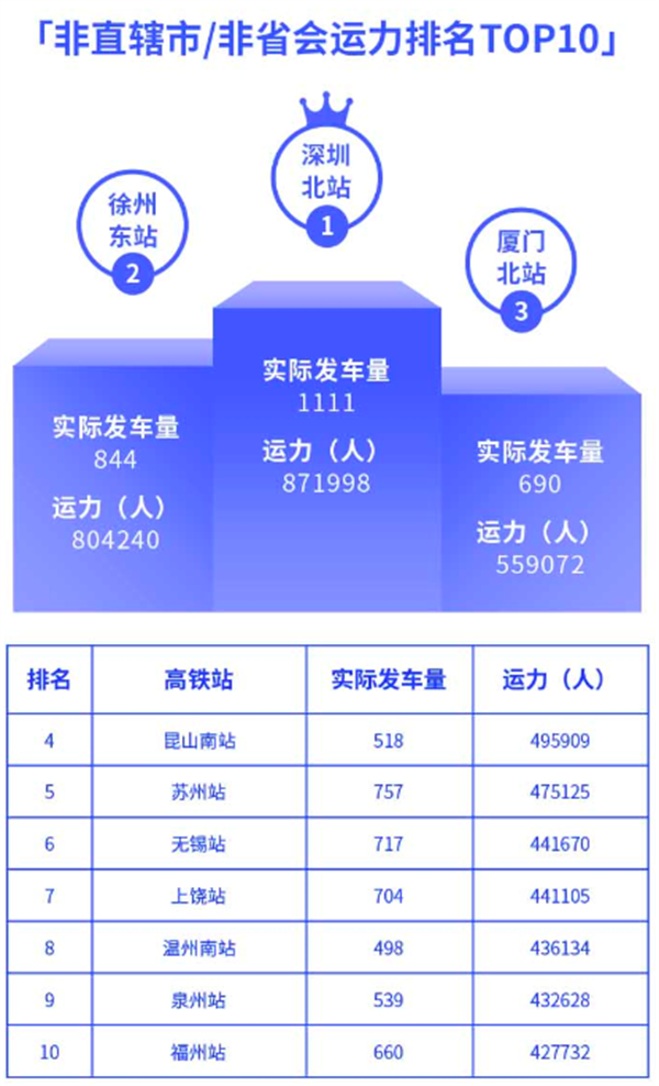 端午假期全国非直辖市/非省会高铁运力TOP10榜单中,深圳北站以1111的实际发车量成为全国非直辖市/非省会高铁运力最高站,其运力超过87万人。徐州东站、厦门北站分列2、3名。