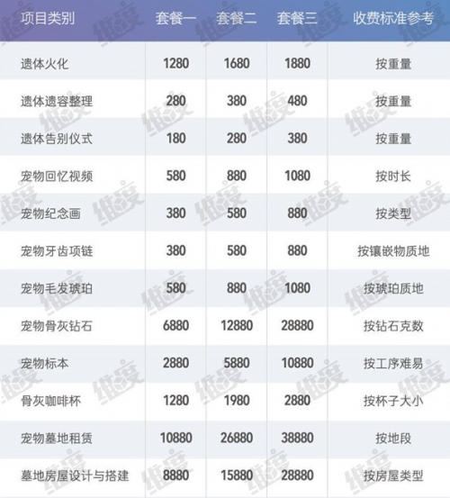 该数据还显示,有53.9%的人愿意在宠物去世后购买火化、墓地等专业化殡葬服务。2017年宠物殡葬服务的购买比例为4.2%,人均总消费达到了1133.1元。参照网上流传的宠物殡葬服务价目表,融360《维度》发现,按照宠物重量不同,收费标准不同,类目上具体分为遗体火化、遗容整理、告别仪式、宠物墓地乃至法师诵经超度,单项最高收费近9万元。融360