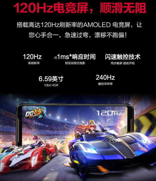 ROG游戏手机2的电竞属性不仅在于其内部硬核,正面比例为19.5:9的AMOLED 10位HDR的电竞屏,其拥有120Hz刷新率及快至1ms的响应速度,6.59英寸的屏幕得到ROG设计师反复验证,其大小为游戏体验的最佳尺寸,不仅能够获得充足既视感的游戏画面,也更符合双手持握的人体工程学,为横屏游戏时的拇指提供充足的操控空间。此外,该屏幕拥有独一无二的Thunder Touch闪速触控技术,使触控延迟快至49ms。