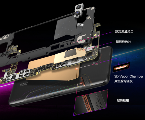 ROG游戏手机2采用3D Vapor Chamber 真空腔均温板+铜铝导热片的全新矩阵式液冷散热架构,内置真正散热池液冷,并配合机身背部的散热格栅导出热量。经过全新升级的酷冷风扇2在结合机身的矩阵式液冷散热框架下,使该机再降3-5度。