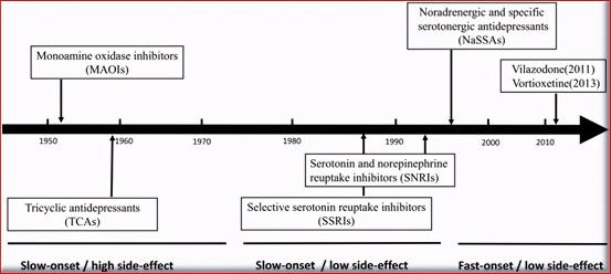 1959年,美国FDA批准了首个用于抗抑郁的药物-丙咪嗪,至今该领域的药物开发已超过了60年。通常,这被认为是重新开发“新药-新理论”的周期过程,并可将其大致分为3个阶段,即“缓慢起效/副作用大”、“缓慢起效/副作用小”、“快速起效/副作用小”。