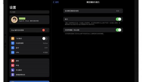 系统更新至上述版本后,iPad 即可在 设置 - 通用 - 隔空播放与接力 中找到「光标和键盘(Beta 版)」的开关。打开它,就完成了在 iPad 上设置 Universal Control 的步骤。