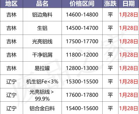 最新1月28日全国铝业厂家收购价西南地区1月28日起,重庆新格集团废铝收货价:棉花包易拉罐14400,压扁易拉罐15100;另纯扣板/吊顶板、铝塑板、1系/3系/5系边角料,看货议价;以上价格针对重庆、巩义、滨州三个场地不含税到厂价。(此处