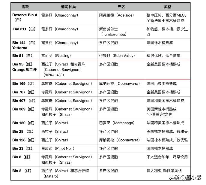 Bin系列从入门级到进阶级都有,甚至奔富最高端的酒也是这个系列的,就是大名鼎鼎的“葛兰许”(Grange)Bin 95。这个Bin是啥意思呢?其实就代表了奔富庄园的藏酒室编号,没啥深奥复杂的秘密,就是一个代号而已。下面整理了bin系列的酒款以及对应信息(作者自行整理,转载请注明出处):