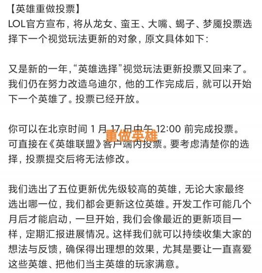 前言:S12赛季的比赛马上就要开始了,相信绝大多数的玩家都关注了最近一段时间的版本变动,官方对于目前的调整是非常在意的,毕竟新的赛季,新的开始,将会有一个全新的面貌展现给众多玩家。这几天里,官方也是发起了一个对于英雄重做的投票,之前绝大多数的玩家都希望官方对乌迪尔进行一个重做,而官方也是尽力地在调整,等到整个的更改都结束之后,官方将会开启新一轮的英雄重做,而这一次的投票,就是做一个准备。一共给大家列出了五个选项,分别是龙女,梦魇,蝎子,蛮王和大嘴。
