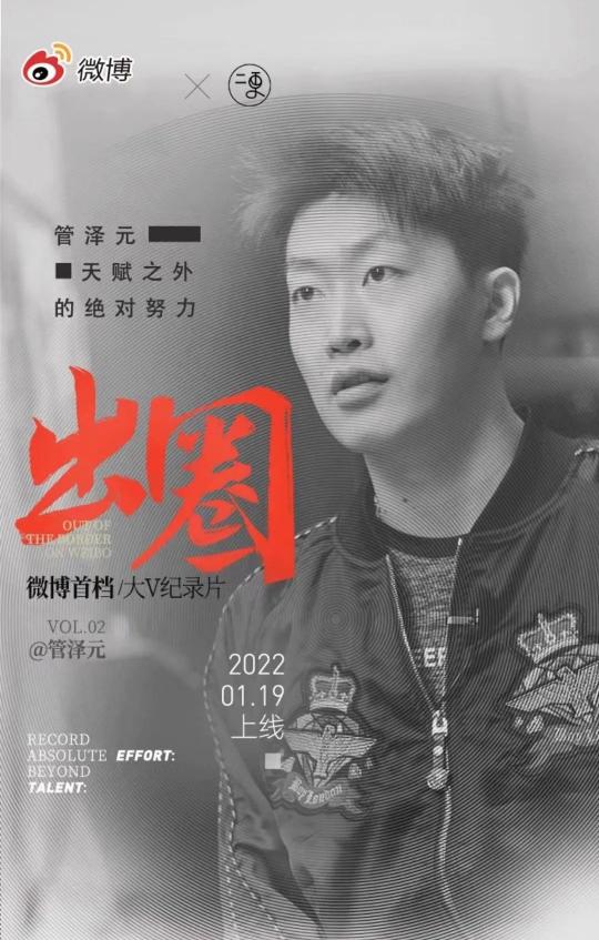 “管泽元”是否已然成为大众视野里“电竞圈”代表人物?2022年1月19日,他成为了微博与二更视频合作拍摄的大V纪录片《出圈》中第二期出场的嘉宾,这一期的海报在微博开屏上挂了一整天,几乎每一个在这一天打开微博的人都看到了海报上的管泽元,以及那句“天赋之外的绝对努力”。