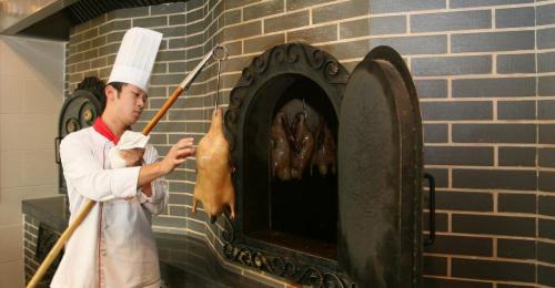 在制作工艺方面,沿袭北方传统的鲁菜风格进行改良。有了荷叶饼卷鸭肉蘸甜面酱、葱的吃法,说到饼、葱、酱的吃法,我们自然而然地想到山东好汉。鸭子也换成了北京的填鸭,皮薄脯大,体重在5斤半到6斤左右,适合烤制。其中以“便宜坊”最为有名,也是北京当下唯一保留的焖炉烤鸭,即烤鸭不见明火,距今已有600多年的历史。
