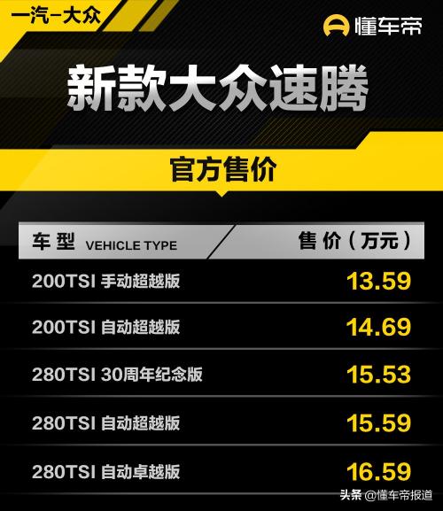 [懂车帝原创 产品] 日前,一汽-大众新款速腾(图片|配置|询价)正式上市,新车共推出5款车型,售价区间为13.59-16.59万元。作为年度改款车型,新车主要对配置方面进行调整。