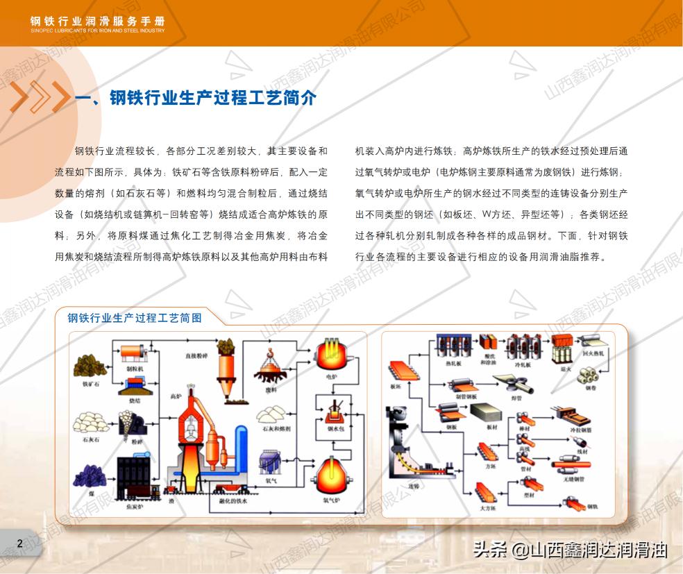 钢铁行业工艺过程用油推荐中分为设备用油和工艺用油两种部分,其中设备用油主要包括:焦化、烧结、炼铁、炼钢、轧钢五大过程设备;工艺用油为轧钢工艺用油