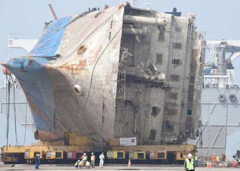 在所有的准备工作做完之后,打捞队终于按照制定好的计划将世越号打捞上岸。在海底沉寂了四年多、埋葬了304条生命的世越号终于重见天日。